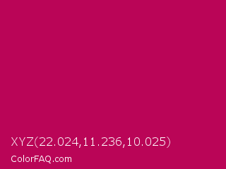 XYZ 22.024,11.236,10.025 Color is a normal rose color and the nearest color is Pictorial Carmine #c30b4e. Hex code #ba0557 and RGB value is rgb(186,5,87). In RGB color space, this color is composed of 73% red, 2% green, 34% blue, In CMYK color space, this color is composed of 0% cyan, 97% magenta, 53% yellow , 27% black , In HSL color space, this color has a hue angle of 333° , 95% saturation and 37% lightness.