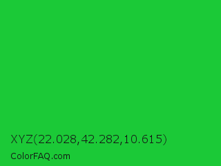 XYZ 22.028,42.282,10.615 Color is a normal green color and the nearest color is Lime Green #32cd32. Hex code #1bc937 and RGB value is rgb(27,201,55). In RGB color space, this color is composed of 11% red, 79% green, 22% blue, In CMYK color space, this color is composed of 87% cyan, 0% magenta, 73% yellow , 21% black , In HSL color space, this color has a hue angle of 130° , 76% saturation and 45% lightness.