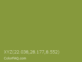 XYZ 22.038,28.177,8.552 Color is a normal lime color and the nearest color is Sycamore #908d39. Hex code #86993c and RGB value is rgb(134,153,60). In RGB color space, this color is composed of 53% red, 60% green, 24% blue, In CMYK color space, this color is composed of 12% cyan, 0% magenta, 61% yellow , 40% black , In HSL color space, this color has a hue angle of 72° , 44% saturation and 42% lightness.