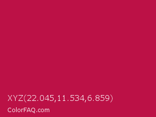XYZ 22.045,11.534,6.859 Color is a normal rose color and the nearest color is Pictorial Carmine #c30b4e. Hex code #bc1146 and RGB value is rgb(188,17,70). In RGB color space, this color is composed of 74% red, 7% green, 27% blue, In CMYK color space, this color is composed of 0% cyan, 91% magenta, 63% yellow , 26% black , In HSL color space, this color has a hue angle of 341° , 83% saturation and 40% lightness.