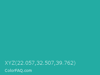 XYZ 22.057,32.507,39.762 Color is a normal cyan color and the nearest color is Light Sea Green #20b2aa. Hex code #23aca3 and RGB value is rgb(35,172,163). In RGB color space, this color is composed of 14% red, 67% green, 64% blue, In CMYK color space, this color is composed of 80% cyan, 0% magenta, 5% yellow , 33% black , In HSL color space, this color has a hue angle of 176° , 66% saturation and 41% lightness.