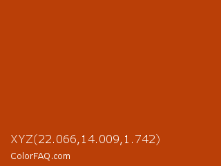 XYZ 22.066,14.009,1.742 Color is a normal orange color and the nearest color is Rock Spray #ba450c. Hex code #ba3f07 and RGB value is rgb(186,63,7). In RGB color space, this color is composed of 73% red, 25% green, 3% blue, In CMYK color space, this color is composed of 0% cyan, 66% magenta, 96% yellow , 27% black , In HSL color space, this color has a hue angle of 19° , 93% saturation and 38% lightness.