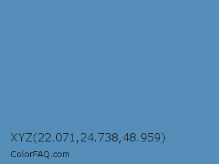 XYZ 22.071,24.738,48.959 Color is a normal blue color and the nearest color is Silver Lake Blue #5d89ba. Hex code #558eb8 and RGB value is rgb(85,142,184). In RGB color space, this color is composed of 33% red, 56% green, 72% blue, In CMYK color space, this color is composed of 54% cyan, 23% magenta, 0% yellow , 28% black , In HSL color space, this color has a hue angle of 205° , 41% saturation and 53% lightness.