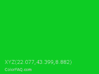 XYZ 22.077,43.399,8.882 Color is a normal green color and the nearest color is Vivid Malachite #00cc33. Hex code #0dcc24 and RGB value is rgb(13,204,36). In RGB color space, this color is composed of 5% red, 80% green, 14% blue, In CMYK color space, this color is composed of 94% cyan, 0% magenta, 82% yellow , 20% black , In HSL color space, this color has a hue angle of 127° , 88% saturation and 43% lightness.