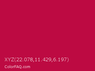 XYZ 22.078,11.429,6.197 Color is a normal rose color and the nearest color is Pictorial Carmine #c30b4e. Hex code #bd0a42 and RGB value is rgb(189,10,66). In RGB color space, this color is composed of 74% red, 4% green, 26% blue, In CMYK color space, this color is composed of 0% cyan, 95% magenta, 65% yellow , 26% black , In HSL color space, this color has a hue angle of 341° , 90% saturation and 39% lightness.