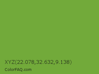 XYZ 22.078,32.632,9.138 Color is a normal green color and the nearest color is Green RYB #66b032. Hex code #72aa3a and RGB value is rgb(114,170,58). In RGB color space, this color is composed of 45% red, 67% green, 23% blue, In CMYK color space, this color is composed of 33% cyan, 0% magenta, 66% yellow , 33% black , In HSL color space, this color has a hue angle of 90° , 49% saturation and 45% lightness.