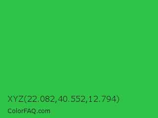 XYZ 22.082,40.552,12.794 Color is a normal green color and the nearest color is Lime Green #32cd32. Hex code #2fc448 and RGB value is rgb(47,196,72). In RGB color space, this color is composed of 18% red, 77% green, 28% blue, In CMYK color space, this color is composed of 76% cyan, 0% magenta, 63% yellow , 23% black , In HSL color space, this color has a hue angle of 130° , 61% saturation and 48% lightness.