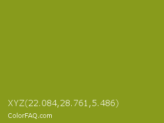 XYZ 22.084,28.761,5.486 Color is a normal yellow color and the nearest color is Trendy Green #7c881a. Hex code #889b1c and RGB value is rgb(136,155,28). In RGB color space, this color is composed of 53% red, 61% green, 11% blue, In CMYK color space, this color is composed of 12% cyan, 0% magenta, 82% yellow , 39% black , In HSL color space, this color has a hue angle of 69° , 69% saturation and 36% lightness.