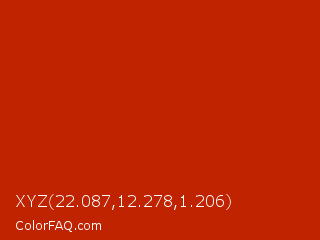 XYZ 22.087,12.278,1.206 Color is a normal red color and the nearest color is International Orange Engineering #ba160c. Hex code #bf2300 and RGB value is rgb(191,35,0). In RGB color space, this color is composed of 75% red, 14% green, 0% blue, In CMYK color space, this color is composed of 0% cyan, 82% magenta, 100% yellow , 25% black , In HSL color space, this color has a hue angle of 11° , 100% saturation and 37% lightness.