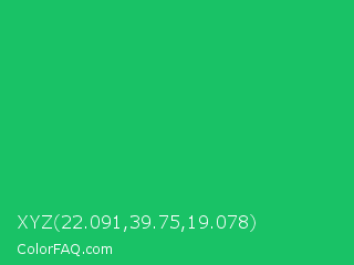 XYZ 22.091,39.75,19.078 Color is a normal green color and the nearest color is Green Crayola #1cac78. Hex code #19c266 and RGB value is rgb(25,194,102). In RGB color space, this color is composed of 10% red, 76% green, 40% blue, In CMYK color space, this color is composed of 87% cyan, 0% magenta, 47% yellow , 24% black , In HSL color space, this color has a hue angle of 147° , 77% saturation and 43% lightness.
