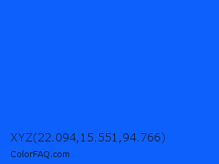 XYZ 22.094,15.551,94.766 Color is a normal blue color and the nearest color is Blue Ribbon #0066ff. Hex code #0e60fd and RGB value is rgb(14,96,253). In RGB color space, this color is composed of 5% red, 38% green, 99% blue, In CMYK color space, this color is composed of 94% cyan, 62% magenta, 0% yellow , 1% black , In HSL color space, this color has a hue angle of 219° , 98% saturation and 52% lightness.