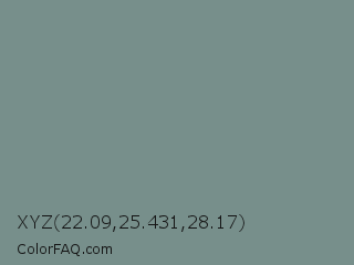 XYZ 22.09,25.431,28.17 Color is a normal cyan color and the nearest color is Blue Smoke #748881. Hex code #778f8b and RGB value is rgb(119,143,139). In RGB color space, this color is composed of 47% red, 56% green, 55% blue, In CMYK color space, this color is composed of 17% cyan, 0% magenta, 3% yellow , 44% black , In HSL color space, this color has a hue angle of 170° , 10% saturation and 51% lightness.