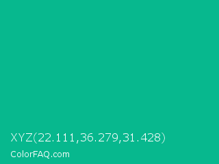 XYZ 22.111,36.279,31.428 Color is a normal cyan color and the nearest color is Persian Green #00a693. Hex code #07b88e and RGB value is rgb(7,184,142). In RGB color space, this color is composed of 3% red, 72% green, 56% blue, In CMYK color space, this color is composed of 96% cyan, 0% magenta, 23% yellow , 28% black , In HSL color space, this color has a hue angle of 166° , 93% saturation and 37% lightness.