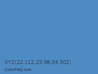 XYZ 22.112,23.98,54.502 Color is a normal blue color and the nearest color is Cyan Blue Azure #4682bf. Hex code #4e8bc2 and RGB value is rgb(78,139,194). In RGB color space, this color is composed of 31% red, 55% green, 76% blue, In CMYK color space, this color is composed of 60% cyan, 28% magenta, 0% yellow , 24% black , In HSL color space, this color has a hue angle of 208° , 49% saturation and 53% lightness.