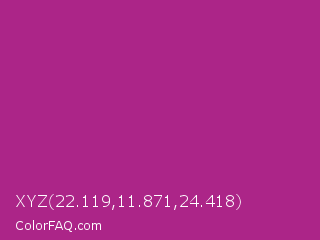 XYZ 22.119,11.871,24.418 Color is a normal magenta color and the nearest color is Fandango #b53389. Hex code #ac2588 and RGB value is rgb(172,37,136). In RGB color space, this color is composed of 67% red, 15% green, 53% blue, In CMYK color space, this color is composed of 0% cyan, 78% magenta, 21% yellow , 33% black , In HSL color space, this color has a hue angle of 316° , 65% saturation and 41% lightness.