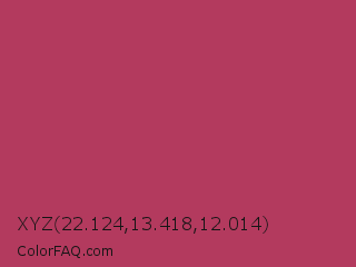XYZ 22.124,13.418,12.014 Color is a normal rose color and the nearest color is Night Shadz #aa375a. Hex code #b33a5e and RGB value is rgb(179,58,94). In RGB color space, this color is composed of 70% red, 23% green, 37% blue, In CMYK color space, this color is composed of 0% cyan, 68% magenta, 47% yellow , 30% black , In HSL color space, this color has a hue angle of 342° , 51% saturation and 46% lightness.