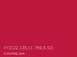 XYZ 22.135,11.769,5.52 Color is a normal red color and the nearest color is Cardinal #c41e3a. Hex code #bd173d and RGB value is rgb(189,23,61). In RGB color space, this color is composed of 74% red, 9% green, 24% blue, In CMYK color space, this color is composed of 0% cyan, 88% magenta, 68% yellow , 26% black , In HSL color space, this color has a hue angle of 346° , 78% saturation and 42% lightness.