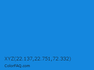 XYZ 22.137,22.751,72.332 Color is a normal blue color and the nearest color is Rich Electric Blue #0892d0. Hex code #1487de and RGB value is rgb(20,135,222). In RGB color space, this color is composed of 8% red, 53% green, 87% blue, In CMYK color space, this color is composed of 91% cyan, 39% magenta, 0% yellow , 13% black , In HSL color space, this color has a hue angle of 206° , 83% saturation and 47% lightness.