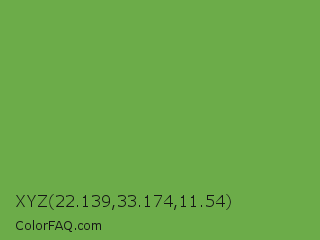 XYZ 22.139,33.174,11.54 Color is a normal green color and the nearest color is Palm Leaf #6f9940. Hex code #6cac49 and RGB value is rgb(108,172,73). In RGB color space, this color is composed of 42% red, 67% green, 29% blue, In CMYK color space, this color is composed of 37% cyan, 0% magenta, 58% yellow , 33% black , In HSL color space, this color has a hue angle of 99° , 40% saturation and 48% lightness.