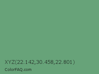 XYZ 22.142,30.458,22.801 Color is a normal green color and the nearest color is Shiny Shamrock #5fa778. Hex code #67a379 and RGB value is rgb(103,163,121). In RGB color space, this color is composed of 40% red, 64% green, 47% blue, In CMYK color space, this color is composed of 37% cyan, 0% magenta, 26% yellow , 36% black , In HSL color space, this color has a hue angle of 138° , 25% saturation and 52% lightness.