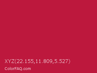 XYZ 22.155,11.809,5.527 Color is a normal red color and the nearest color is Cardinal #c41e3a. Hex code #bd183d and RGB value is rgb(189,24,61). In RGB color space, this color is composed of 74% red, 9% green, 24% blue, In CMYK color space, this color is composed of 0% cyan, 87% magenta, 68% yellow , 26% black , In HSL color space, this color has a hue angle of 347° , 77% saturation and 42% lightness.