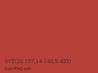 XYZ 22.157,14.143,5.433 Color is a normal red color and the nearest color is Medium Carmine #af4035. Hex code #b74139 and RGB value is rgb(183,65,57). In RGB color space, this color is composed of 72% red, 25% green, 22% blue, In CMYK color space, this color is composed of 0% cyan, 64% magenta, 69% yellow , 28% black , In HSL color space, this color has a hue angle of 4° , 53% saturation and 47% lightness.