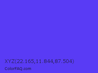XYZ 22.165,11.844,87.504 Color is a normal indigo color and the nearest color is Majorelle Blue #6050dc. Hex code #593bf5 and RGB value is rgb(89,59,245). In RGB color space, this color is composed of 35% red, 23% green, 96% blue, In CMYK color space, this color is composed of 64% cyan, 76% magenta, 0% yellow , 4% black , In HSL color space, this color has a hue angle of 250° , 90% saturation and 60% lightness.