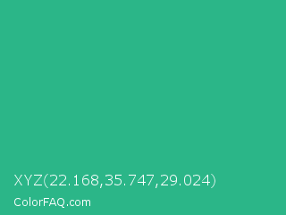 XYZ 22.168,35.747,29.024 Color is a normal green color and the nearest color is Mountain Meadow #30ba8f. Hex code #2bb688 and RGB value is rgb(43,182,136). In RGB color space, this color is composed of 17% red, 71% green, 53% blue, In CMYK color space, this color is composed of 76% cyan, 0% magenta, 25% yellow , 29% black , In HSL color space, this color has a hue angle of 160° , 62% saturation and 44% lightness.