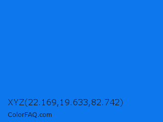 XYZ 22.169,19.633,82.742 Color is a normal blue color and the nearest color is Azure Radiance #007fff. Hex code #0d78ed and RGB value is rgb(13,120,237). In RGB color space, this color is composed of 5% red, 47% green, 93% blue, In CMYK color space, this color is composed of 95% cyan, 49% magenta, 0% yellow , 7% black , In HSL color space, this color has a hue angle of 211° , 90% saturation and 49% lightness.