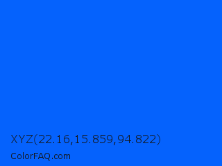 XYZ 22.16,15.859,94.822 Color is a normal blue color and the nearest color is Blue Ribbon #0066ff. Hex code #0562fd and RGB value is rgb(5,98,253). In RGB color space, this color is composed of 2% red, 38% green, 99% blue, In CMYK color space, this color is composed of 98% cyan, 61% magenta, 0% yellow , 1% black , In HSL color space, this color has a hue angle of 218° , 98% saturation and 51% lightness.