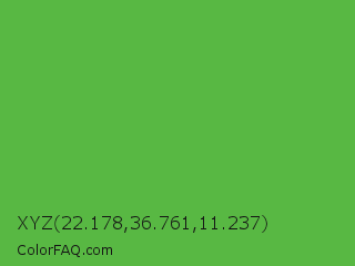 XYZ 22.178,36.761,11.237 Color is a normal green color and the nearest color is Apple #4fa83d. Hex code #58b843 and RGB value is rgb(88,184,67). In RGB color space, this color is composed of 35% red, 72% green, 26% blue, In CMYK color space, this color is composed of 52% cyan, 0% magenta, 64% yellow , 28% black , In HSL color space, this color has a hue angle of 109° , 47% saturation and 49% lightness.