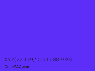 XYZ 22.179,10.945,88.939 Color is a normal indigo color and the nearest color is Han Purple #5218fa. Hex code #5c2ef7 and RGB value is rgb(92,46,247). In RGB color space, this color is composed of 36% red, 18% green, 97% blue, In CMYK color space, this color is composed of 63% cyan, 81% magenta, 0% yellow , 3% black , In HSL color space, this color has a hue angle of 254° , 93% saturation and 57% lightness.