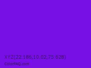 XYZ 22.186,10.02,75.628 Color is a normal violet color and the nearest color is Violet Color Wheel #7f00ff. Hex code #780ee6 and RGB value is rgb(120,14,230). In RGB color space, this color is composed of 47% red, 5% green, 90% blue, In CMYK color space, this color is composed of 48% cyan, 94% magenta, 0% yellow , 10% black , In HSL color space, this color has a hue angle of 269° , 89% saturation and 48% lightness.