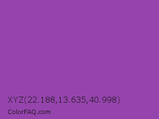 XYZ 22.188,13.635,40.998 Color is a normal purple color and the nearest color is Purpureus #9a4eae. Hex code #9644ad and RGB value is rgb(150,68,173). In RGB color space, this color is composed of 59% red, 27% green, 68% blue, In CMYK color space, this color is composed of 13% cyan, 61% magenta, 0% yellow , 32% black , In HSL color space, this color has a hue angle of 287° , 44% saturation and 47% lightness.