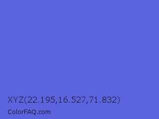 XYZ 22.195,16.527,71.832 Color is a light blue color and the nearest color is Majorelle Blue #6050dc. Hex code #5c63df and RGB value is rgb(92,99,223). In RGB color space, this color is composed of 36% red, 39% green, 87% blue, In CMYK color space, this color is composed of 59% cyan, 56% magenta, 0% yellow , 13% black , In HSL color space, this color has a hue angle of 237° , 67% saturation and 62% lightness.