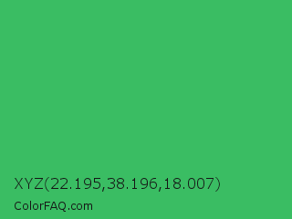 XYZ 22.195,38.196,18.007 Color is a normal green color and the nearest color is Medium Sea Green #3cb371. Hex code #3abd63 and RGB value is rgb(58,189,99). In RGB color space, this color is composed of 23% red, 74% green, 39% blue, In CMYK color space, this color is composed of 69% cyan, 0% magenta, 48% yellow , 26% black , In HSL color space, this color has a hue angle of 139° , 53% saturation and 48% lightness.