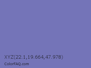 XYZ 22.1,19.664,47.978 Color is a normal blue color and the nearest color is Toolbox #746cc0. Hex code #7474b8 and RGB value is rgb(116,116,184). In RGB color space, this color is composed of 45% red, 45% green, 72% blue, In CMYK color space, this color is composed of 37% cyan, 37% magenta, 0% yellow , 28% black , In HSL color space, this color has a hue angle of 240° , 32% saturation and 59% lightness.