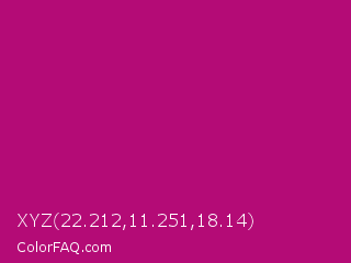 XYZ 22.212,11.251,18.14 Color is a normal magenta color and the nearest color is Lipstick #ab0563. Hex code #b40b76 and RGB value is rgb(180,11,118). In RGB color space, this color is composed of 71% red, 4% green, 46% blue, In CMYK color space, this color is composed of 0% cyan, 94% magenta, 34% yellow , 29% black , In HSL color space, this color has a hue angle of 322° , 88% saturation and 37% lightness.