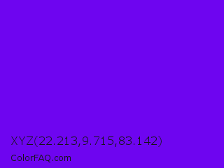XYZ 22.213,9.715,83.142 Color is a normal violet color and the nearest color is Electric Indigo #6f00ff. Hex code #6e05f0 and RGB value is rgb(110,5,240). In RGB color space, this color is composed of 43% red, 2% green, 94% blue, In CMYK color space, this color is composed of 54% cyan, 98% magenta, 0% yellow , 6% black , In HSL color space, this color has a hue angle of 267° , 96% saturation and 48% lightness.