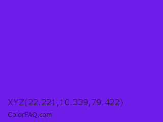 XYZ 22.221,10.339,79.422 Color is a normal violet color and the nearest color is Blue Violet #8a2be2. Hex code #711ceb and RGB value is rgb(113,28,235). In RGB color space, this color is composed of 44% red, 11% green, 92% blue, In CMYK color space, this color is composed of 52% cyan, 88% magenta, 0% yellow , 8% black , In HSL color space, this color has a hue angle of 265° , 84% saturation and 52% lightness.