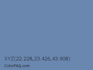 XYZ 22.228,23.426,43.908 Color is a normal blue color and the nearest color is Glaucous #6082b6. Hex code #6987af and RGB value is rgb(105,135,175). In RGB color space, this color is composed of 41% red, 53% green, 69% blue, In CMYK color space, this color is composed of 40% cyan, 23% magenta, 0% yellow , 31% black , In HSL color space, this color has a hue angle of 214° , 30% saturation and 55% lightness.