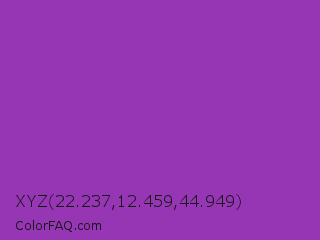 XYZ 22.237,12.459,44.949 Color is a normal purple color and the nearest color is Dark Orchid #9932cc. Hex code #9636b5 and RGB value is rgb(150,54,181). In RGB color space, this color is composed of 59% red, 21% green, 71% blue, In CMYK color space, this color is composed of 17% cyan, 70% magenta, 0% yellow , 29% black , In HSL color space, this color has a hue angle of 285° , 54% saturation and 46% lightness.