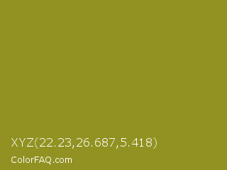XYZ 22.23,26.687,5.418 Color is a normal yellow color and the nearest color is Hacienda #98811b. Hex code #919221 and RGB value is rgb(145,146,33). In RGB color space, this color is composed of 57% red, 57% green, 13% blue, In CMYK color space, this color is composed of 1% cyan, 0% magenta, 77% yellow , 43% black , In HSL color space, this color has a hue angle of 61° , 63% saturation and 35% lightness.