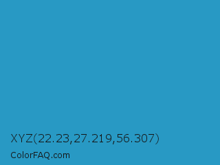 XYZ 22.23,27.219,56.307 Color is a normal blue color and the nearest color is Curious Blue #2596d1. Hex code #2899c4 and RGB value is rgb(40,153,196). In RGB color space, this color is composed of 16% red, 60% green, 77% blue, In CMYK color space, this color is composed of 80% cyan, 22% magenta, 0% yellow , 23% black , In HSL color space, this color has a hue angle of 197° , 66% saturation and 46% lightness.