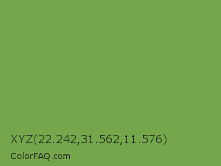 XYZ 22.242,31.562,11.576 Color is a normal green color and the nearest color is Palm Leaf #6f9940. Hex code #75a64b and RGB value is rgb(117,166,75). In RGB color space, this color is composed of 46% red, 65% green, 29% blue, In CMYK color space, this color is composed of 30% cyan, 0% magenta, 55% yellow , 35% black , In HSL color space, this color has a hue angle of 92° , 38% saturation and 47% lightness.