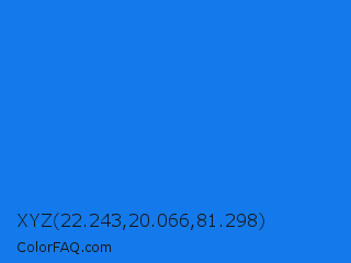 XYZ 22.243,20.066,81.298 Color is a normal blue color and the nearest color is Blue Crayola #1f75fe. Hex code #147aeb and RGB value is rgb(20,122,235). In RGB color space, this color is composed of 8% red, 48% green, 92% blue, In CMYK color space, this color is composed of 91% cyan, 48% magenta, 0% yellow , 8% black , In HSL color space, this color has a hue angle of 212° , 84% saturation and 50% lightness.
