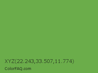 XYZ 22.243,33.507,11.774 Color is a normal green color and the nearest color is Palm Leaf #6f9940. Hex code #6bad4a and RGB value is rgb(107,173,74). In RGB color space, this color is composed of 42% red, 68% green, 29% blue, In CMYK color space, this color is composed of 38% cyan, 0% magenta, 57% yellow , 32% black , In HSL color space, this color has a hue angle of 100° , 40% saturation and 48% lightness.