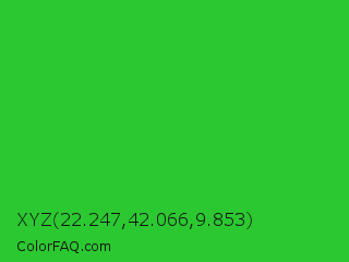 XYZ 22.247,42.066,9.853 Color is a normal green color and the nearest color is Lime Green #32cd32. Hex code #2cc831 and RGB value is rgb(44,200,49). In RGB color space, this color is composed of 17% red, 78% green, 19% blue, In CMYK color space, this color is composed of 78% cyan, 0% magenta, 76% yellow , 22% black , In HSL color space, this color has a hue angle of 122° , 64% saturation and 48% lightness.