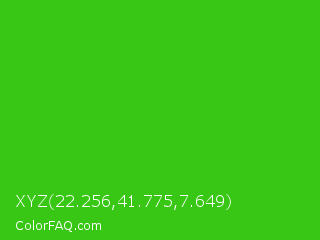 XYZ 22.256,41.775,7.649 Color is a normal green color and the nearest color is Harlequin Green #46cb18. Hex code #39c716 and RGB value is rgb(57,199,22). In RGB color space, this color is composed of 22% red, 78% green, 9% blue, In CMYK color space, this color is composed of 71% cyan, 0% magenta, 89% yellow , 22% black , In HSL color space, this color has a hue angle of 108° , 80% saturation and 43% lightness.