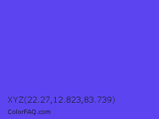 XYZ 22.27,12.823,83.739 Color is a light indigo color and the nearest color is Majorelle Blue #6050dc. Hex code #5c45f0 and RGB value is rgb(92,69,240). In RGB color space, this color is composed of 36% red, 27% green, 94% blue, In CMYK color space, this color is composed of 62% cyan, 71% magenta, 0% yellow , 6% black , In HSL color space, this color has a hue angle of 248° , 85% saturation and 61% lightness.